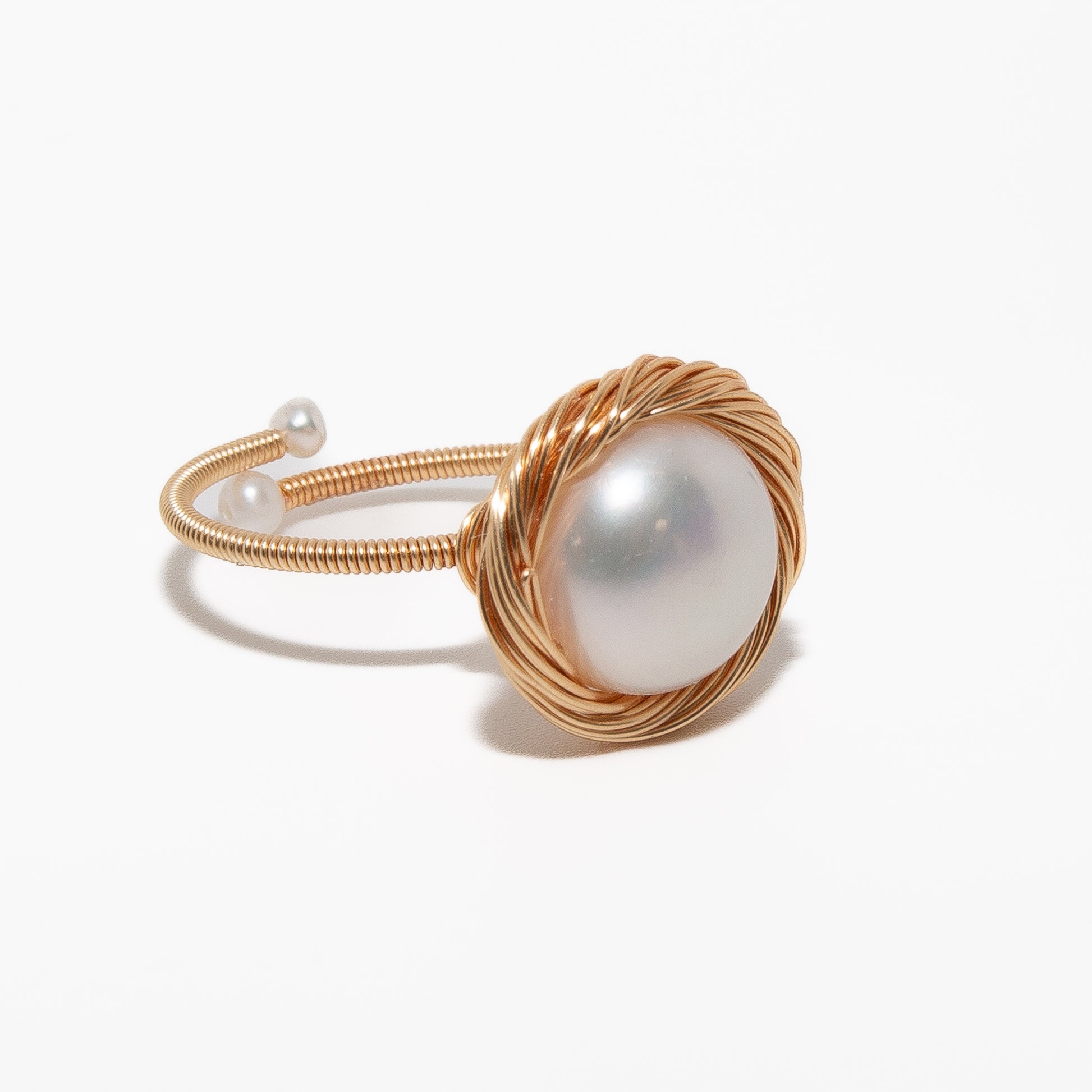 Our Golden Rosette Ring features a radiant freshwater pearl that rests at the center of a gold-filled rosette design, accented by two petite pearls in the back for an elegant and balanced finish.