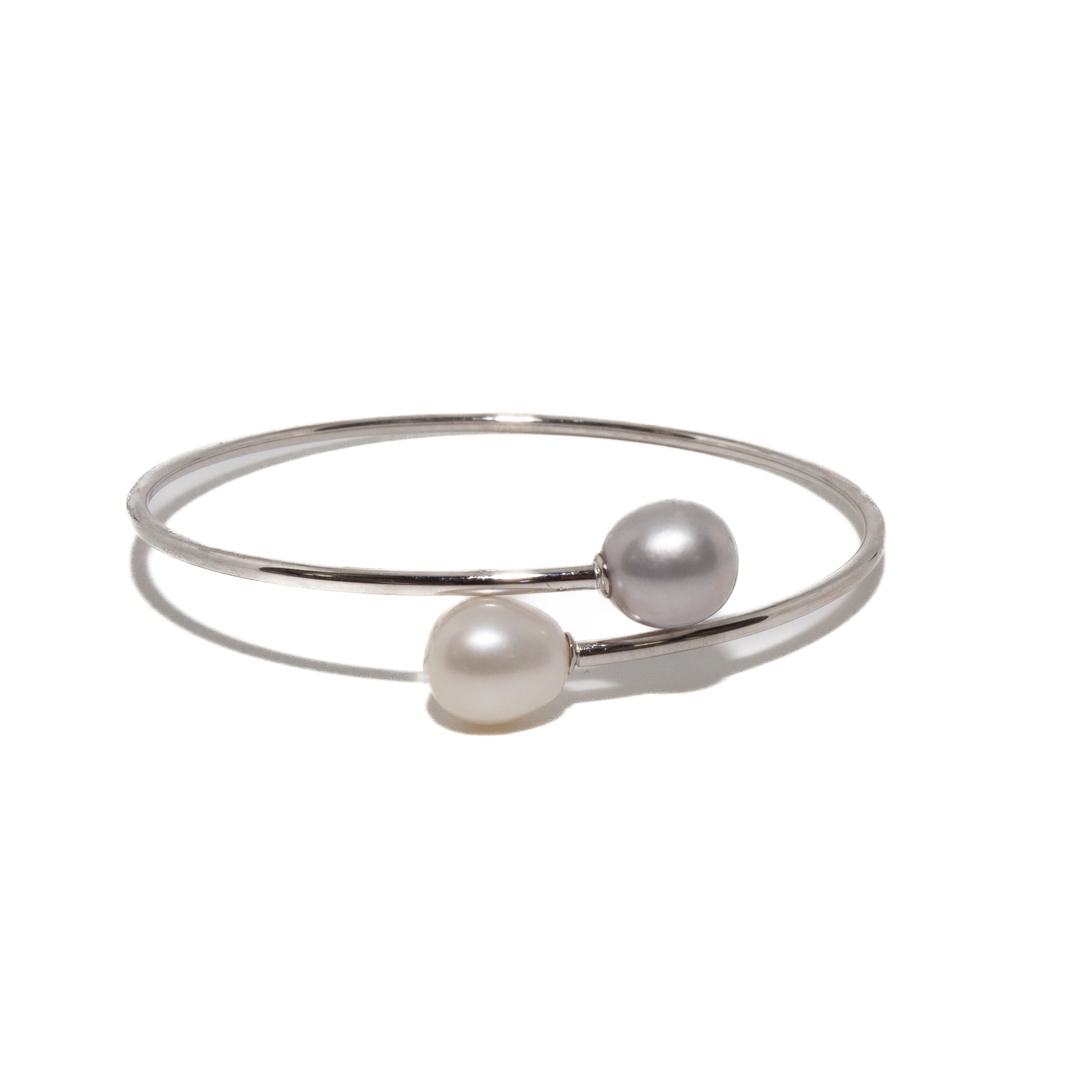 OurTidal Whisper Bracelet features two radiant freshwater pearls, each at the end of a sleek sterling silver band. Modern, minimal, and timeless, this open cuff slips on effortlessly for an elegant everyday statement.