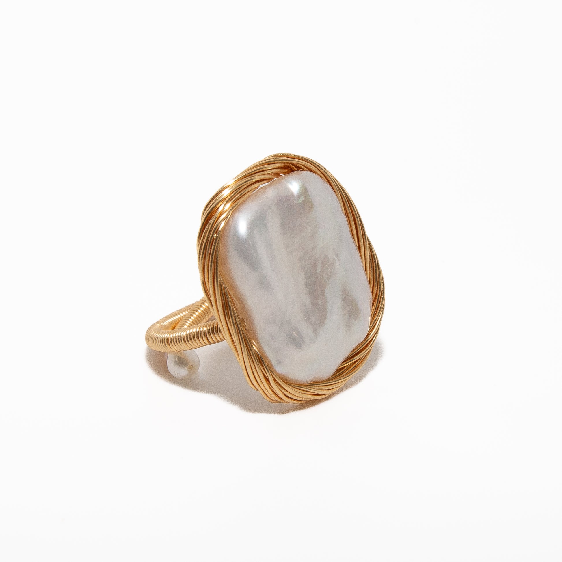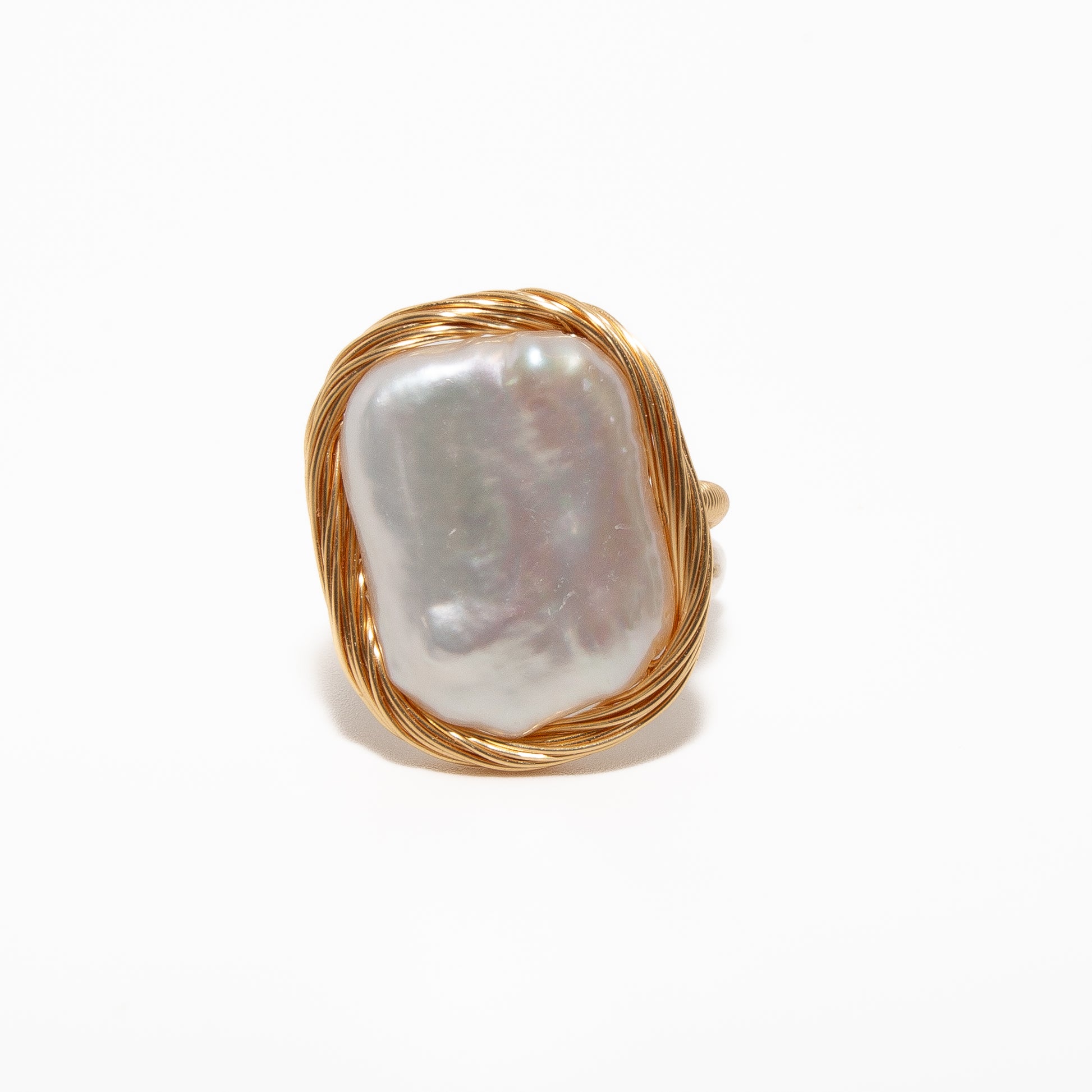 Our Golden Botero Ring exudes refined artistry, featuring a striking rectangular freshwater pearl embraced by hand-wrapped gold-filled wire. Its sculptural design and organic texture make it a statement of elegance and individuality.