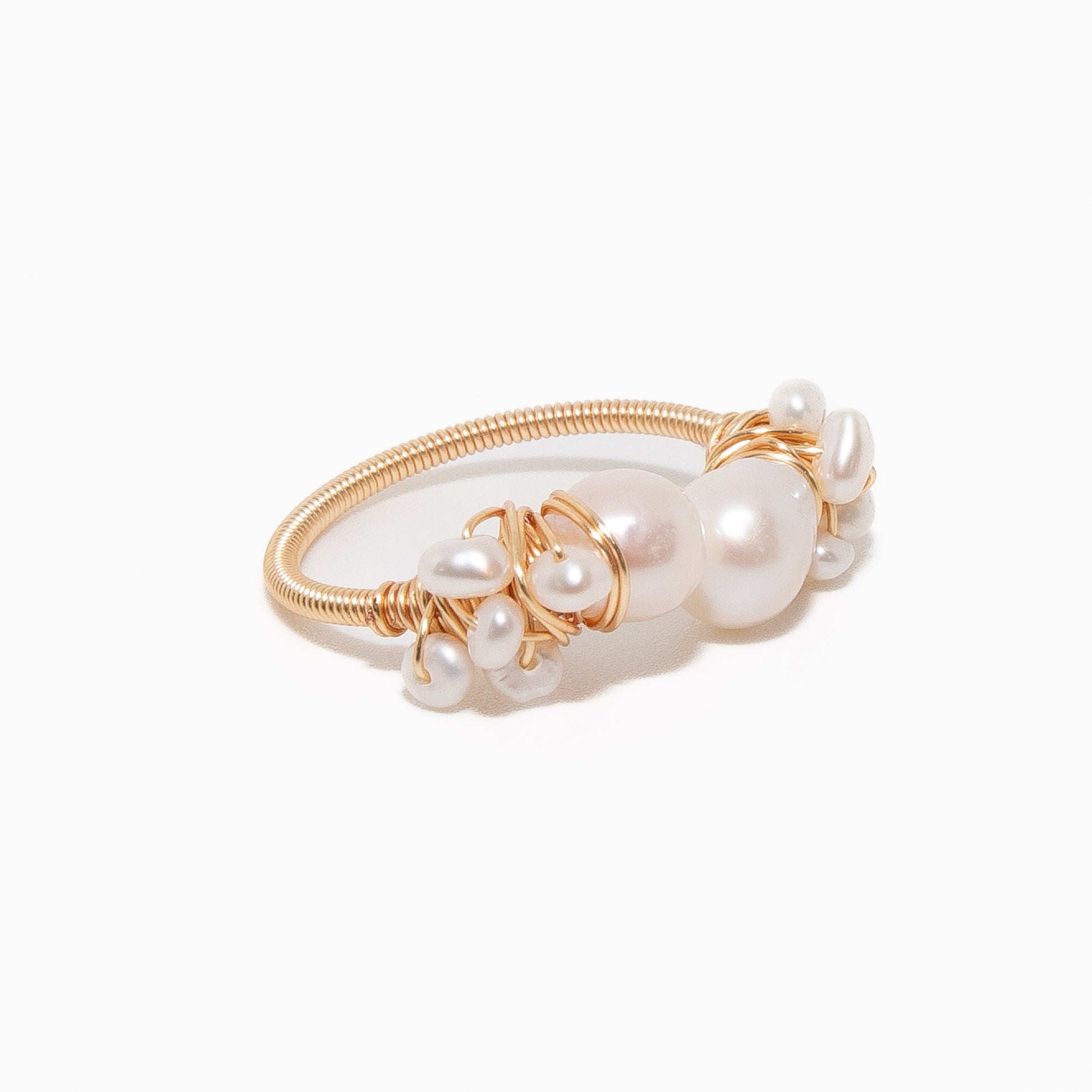 Our Golden Laurel Ring features two exquisite Keshi pearls, gracefully encircled by clusters of petite freshwater pearls, meticulously hand-wrapped in gold-filled wire.
