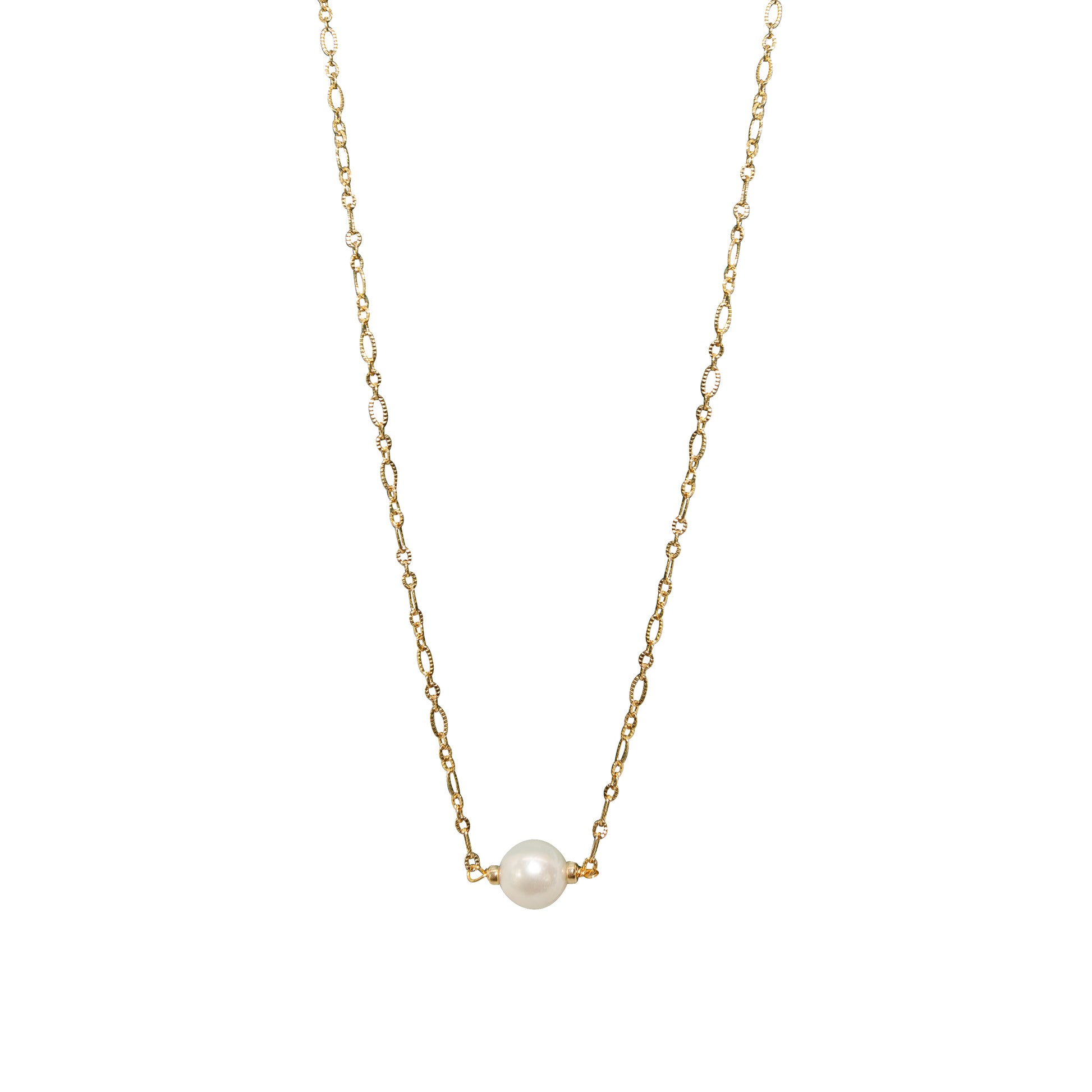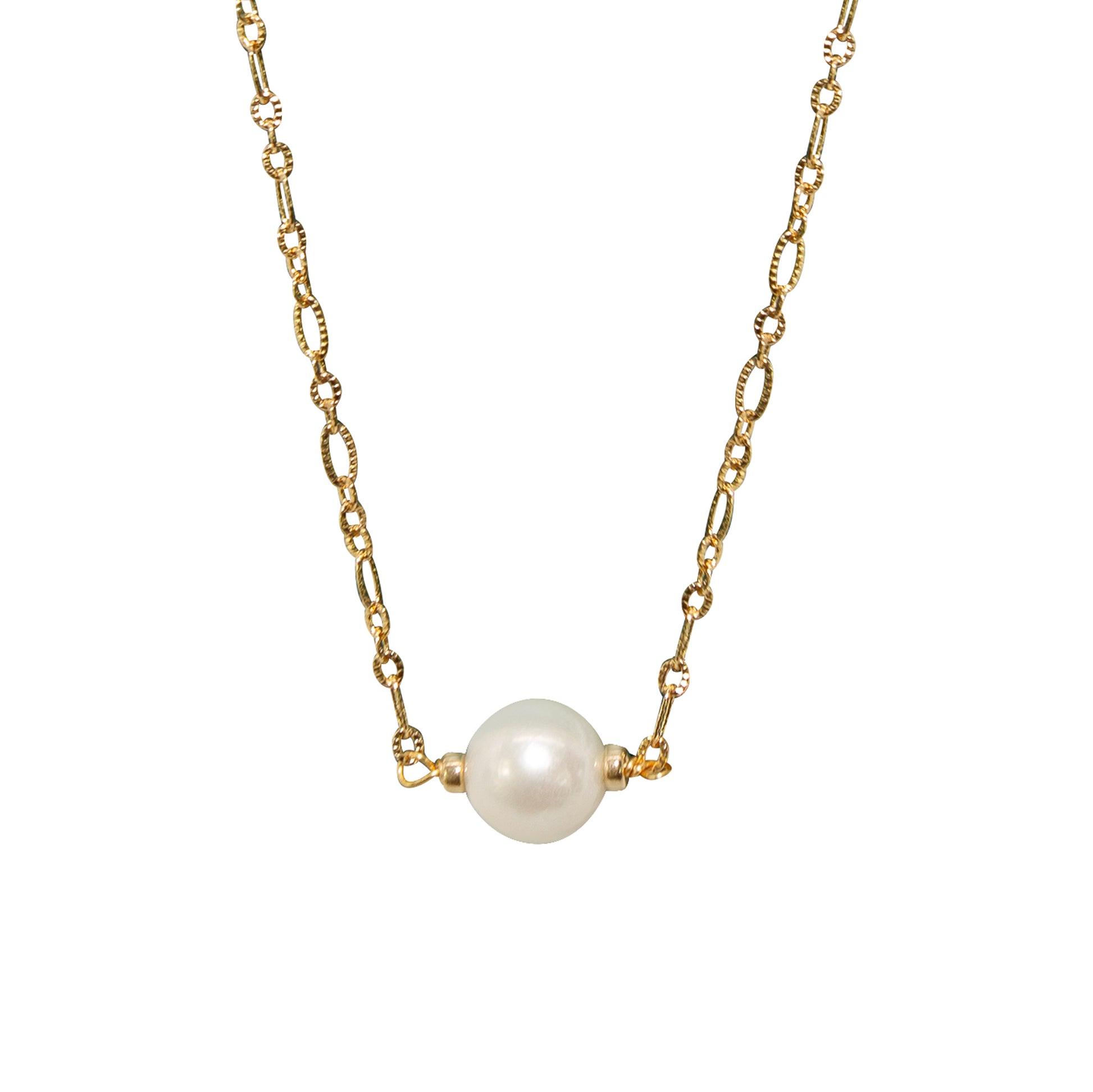 Our Golden Link Necklace showcases a radiant 9mm golden pearl suspended from an elegant gold-filled linked chain. Its warm glow and refined simplicity evoke timeless sophistication.