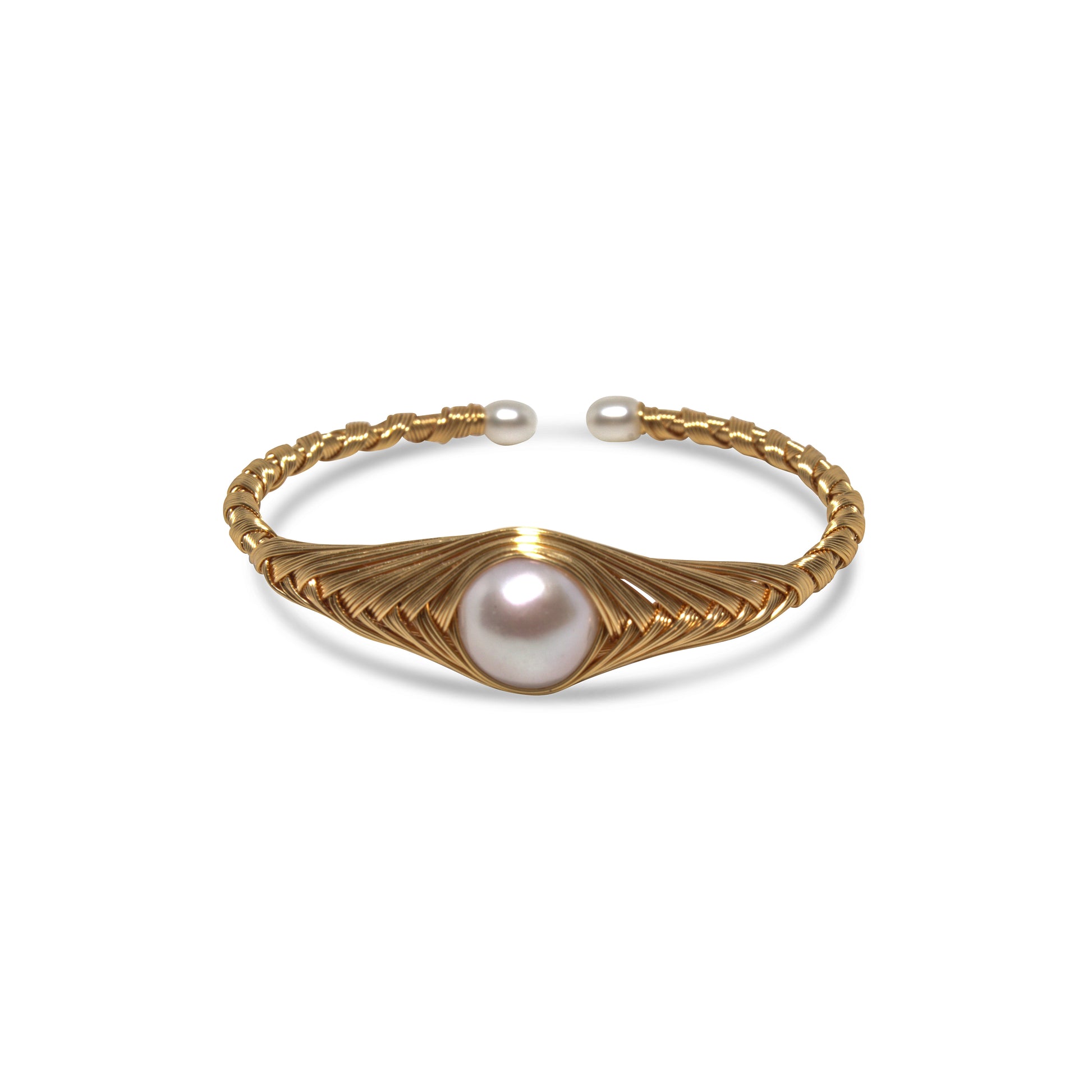 Our Golden Weave Bracelet features a radiant white freshwater pearl embraced by intricately wrapped gold-filled wire. Its rich texture and radiant glow bring a touch of modern luxury to any look.