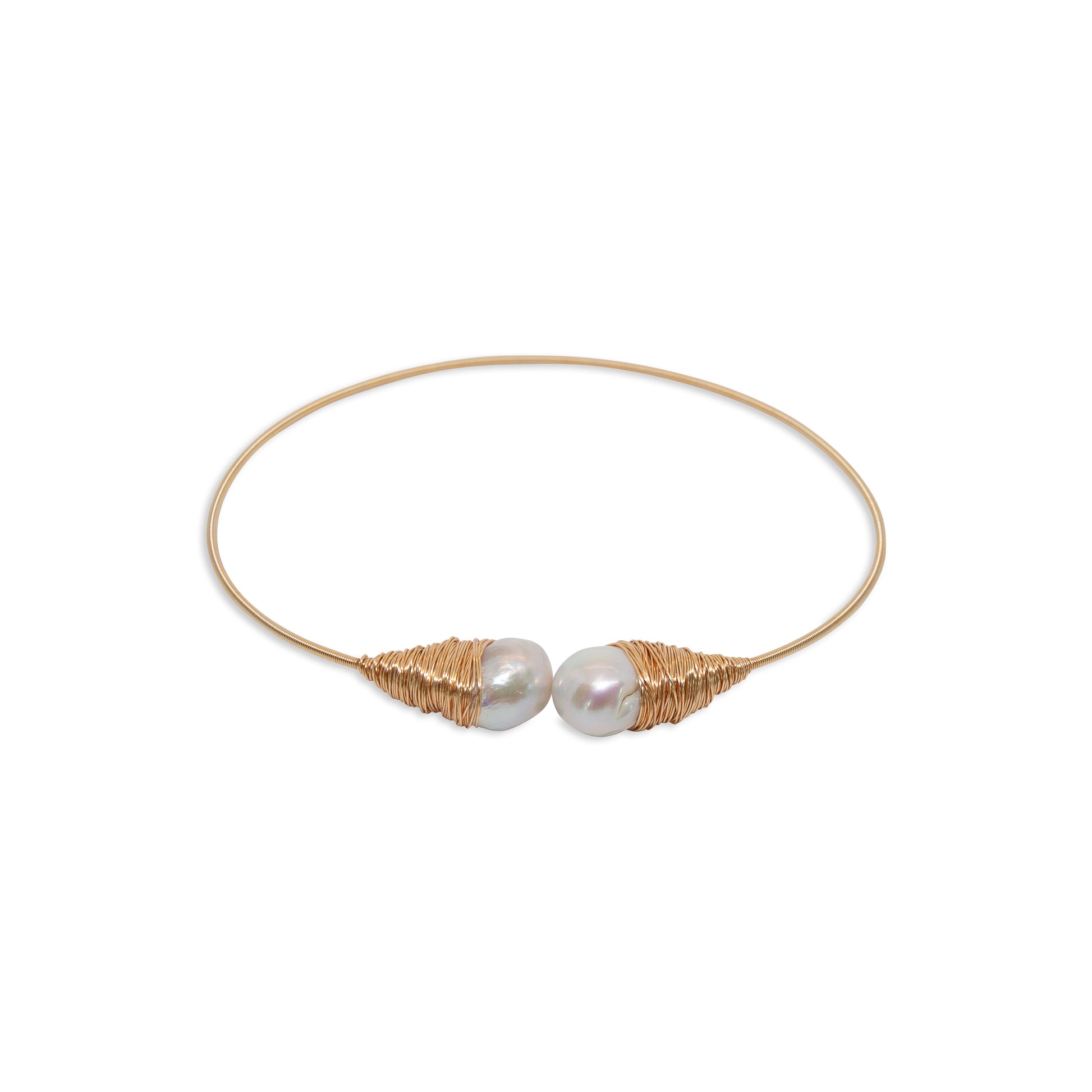 Our Golden Tide Baroque Necklace features two bold baroque pearls beautifully wrapped in gold-filled wire, creating a fluid, sculptural design.