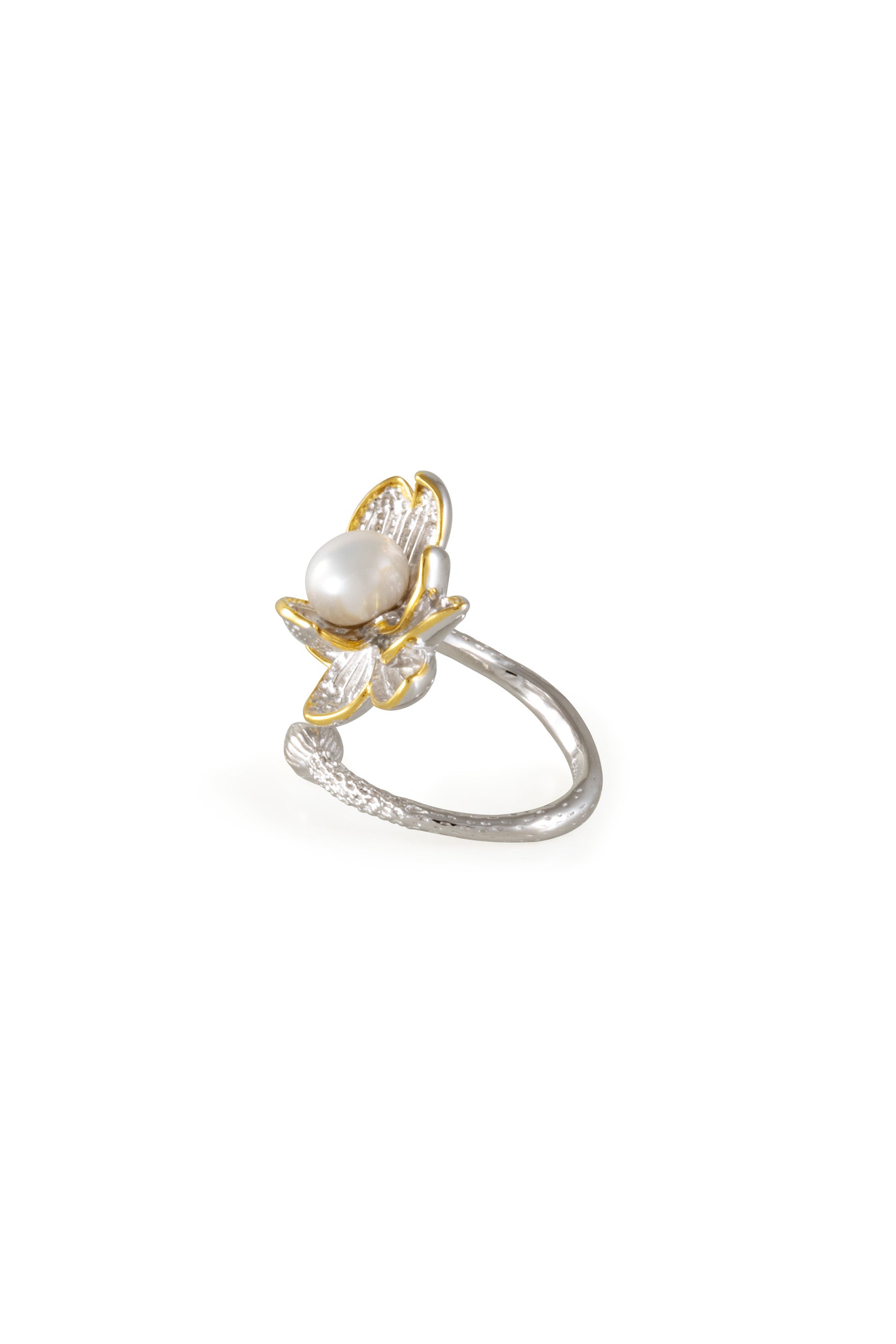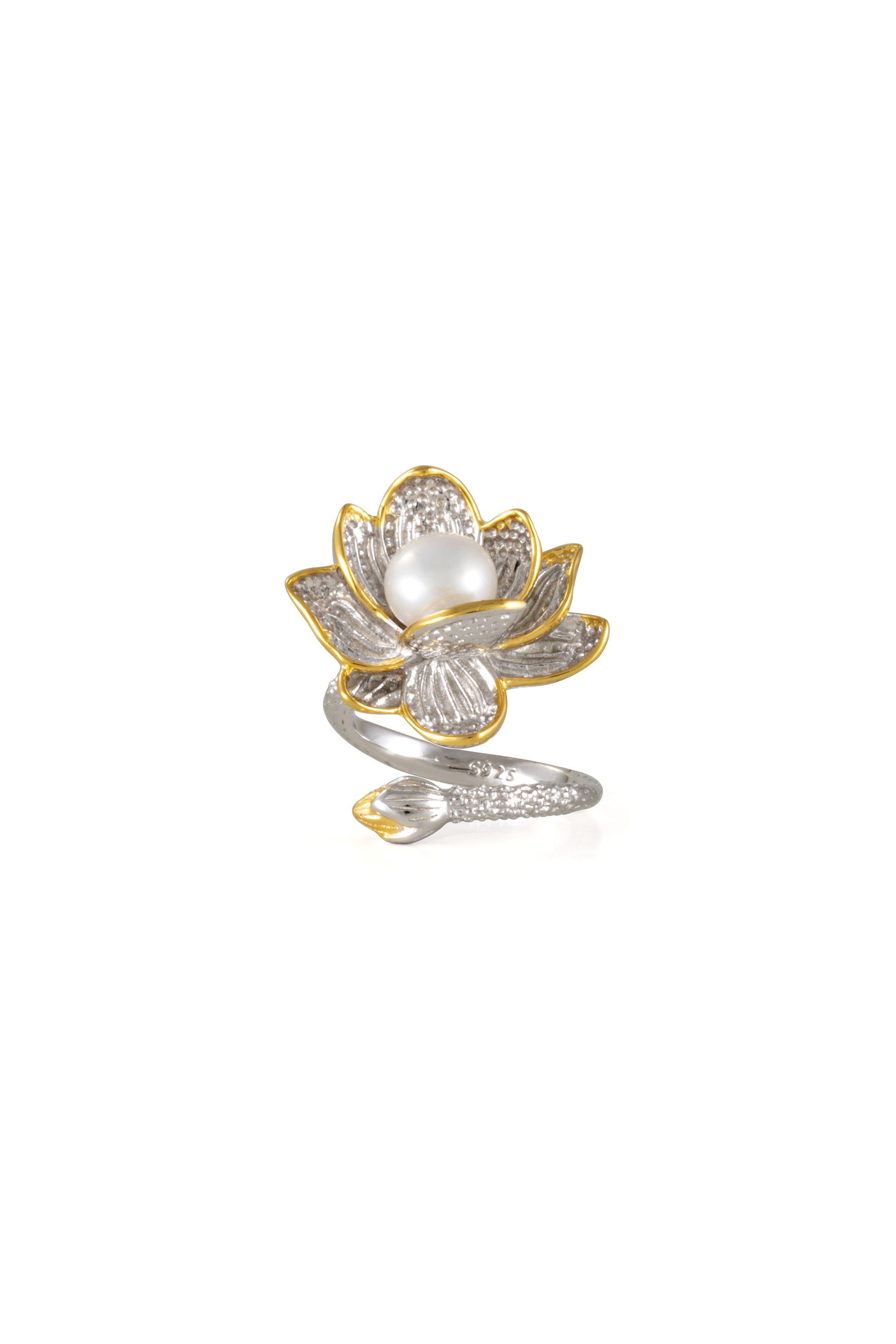 Our Lotus Ring features a blooming lotus design in sterling silver, accented with warm gold plating and centered around a luminous freshwater pearl. The gently adjustable band wraps softly around the finger.