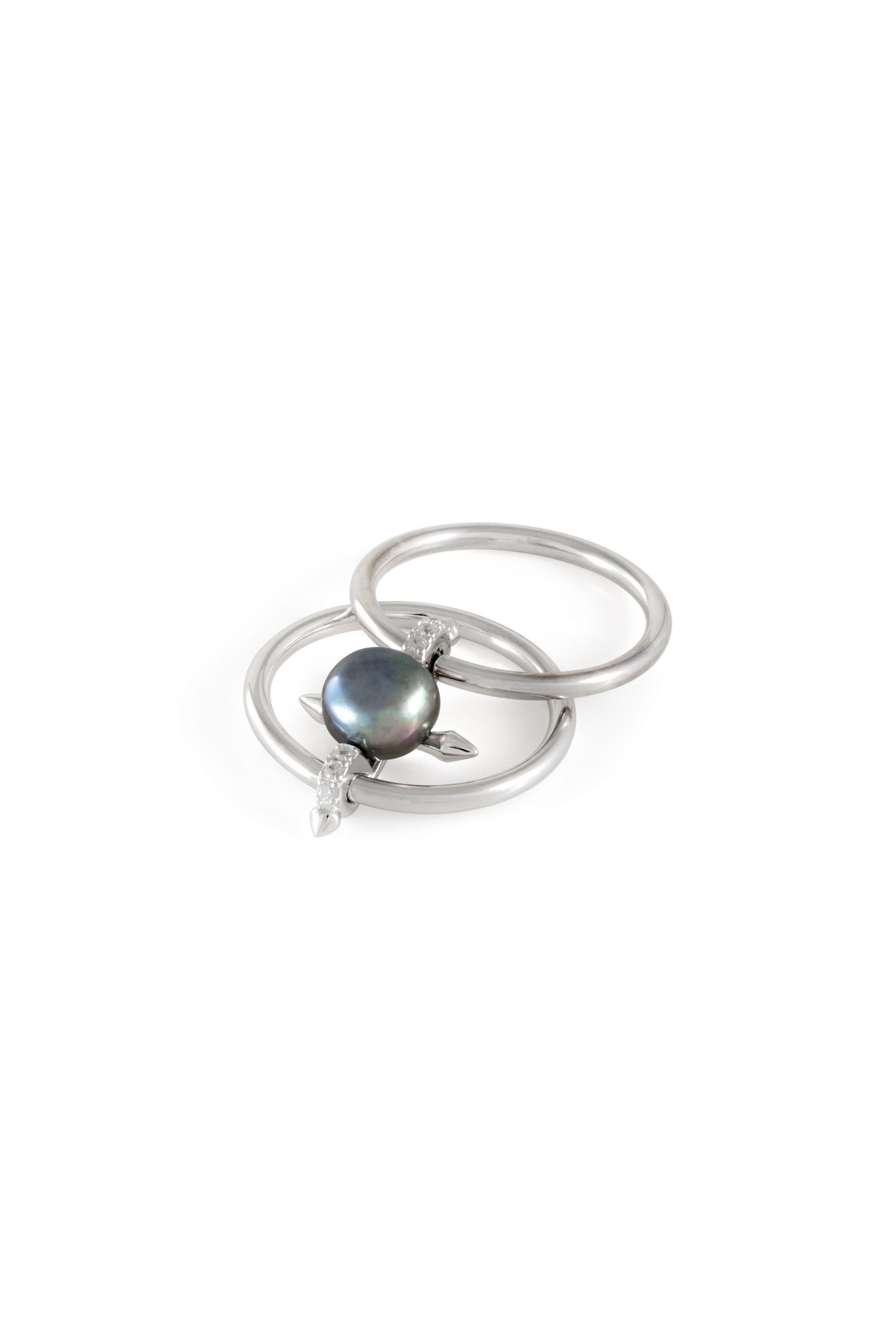 Our Axis Pearl Ring is crafted in sterling silver with a dark freshwater pearl at its center, framed by twin bands that expand and collapse. Its sleek, architectural form and subtle flexibility make it a standout piece.