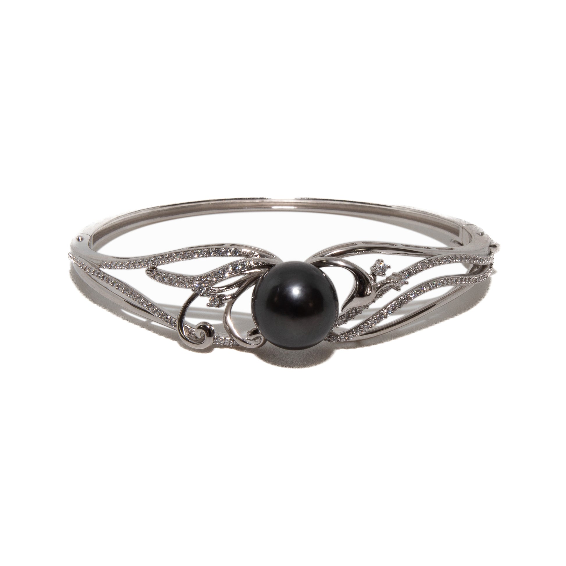 Our Tahitian Symphony Bracelet features a stunning Tahitian pearl resting at the heart of an intricate sterling silver design, adorned with sparkling accents that flow like musical notes.