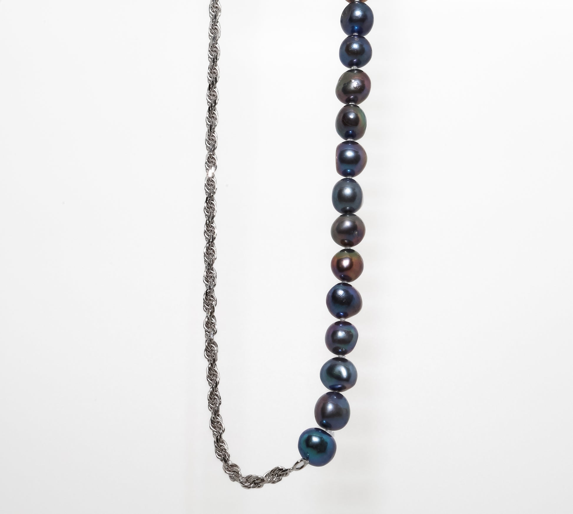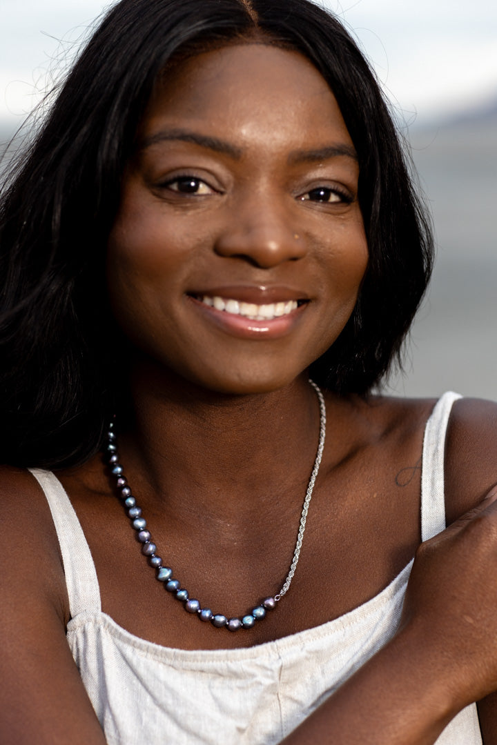 Our Midnight Tide Necklace features a strand of violet and blue iridescent freshwater pearls delicately strung along a braided sterling silver chain. Each pearl reflects the shifting tones of twilight, capturing the serene mystery of the ocean at dusk