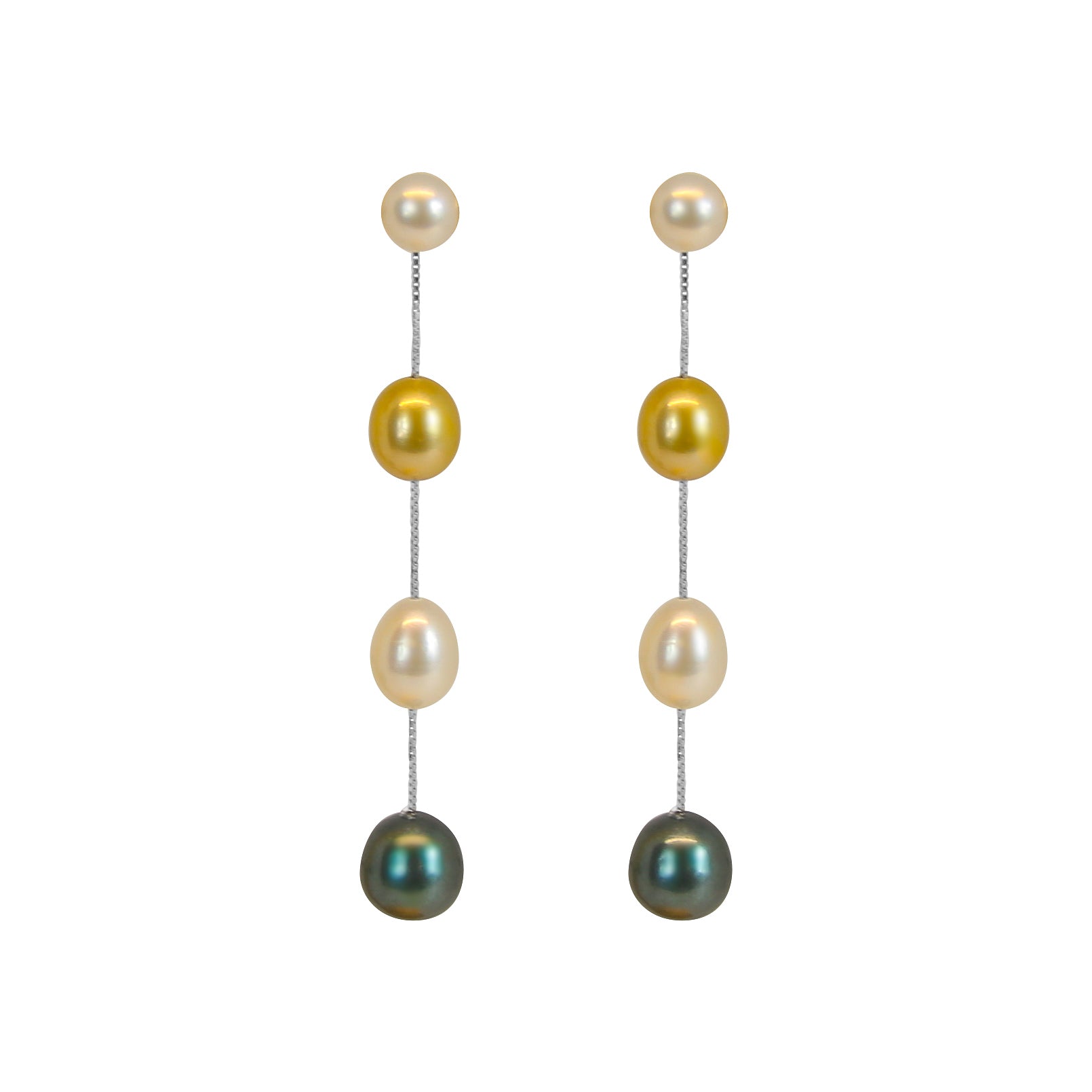 Our Sunrise Symphony Earrings showcase a stunning trio of pearls in soft white, radiant golden, and iridescent green tones, gracefully suspended on sterling silver chains.