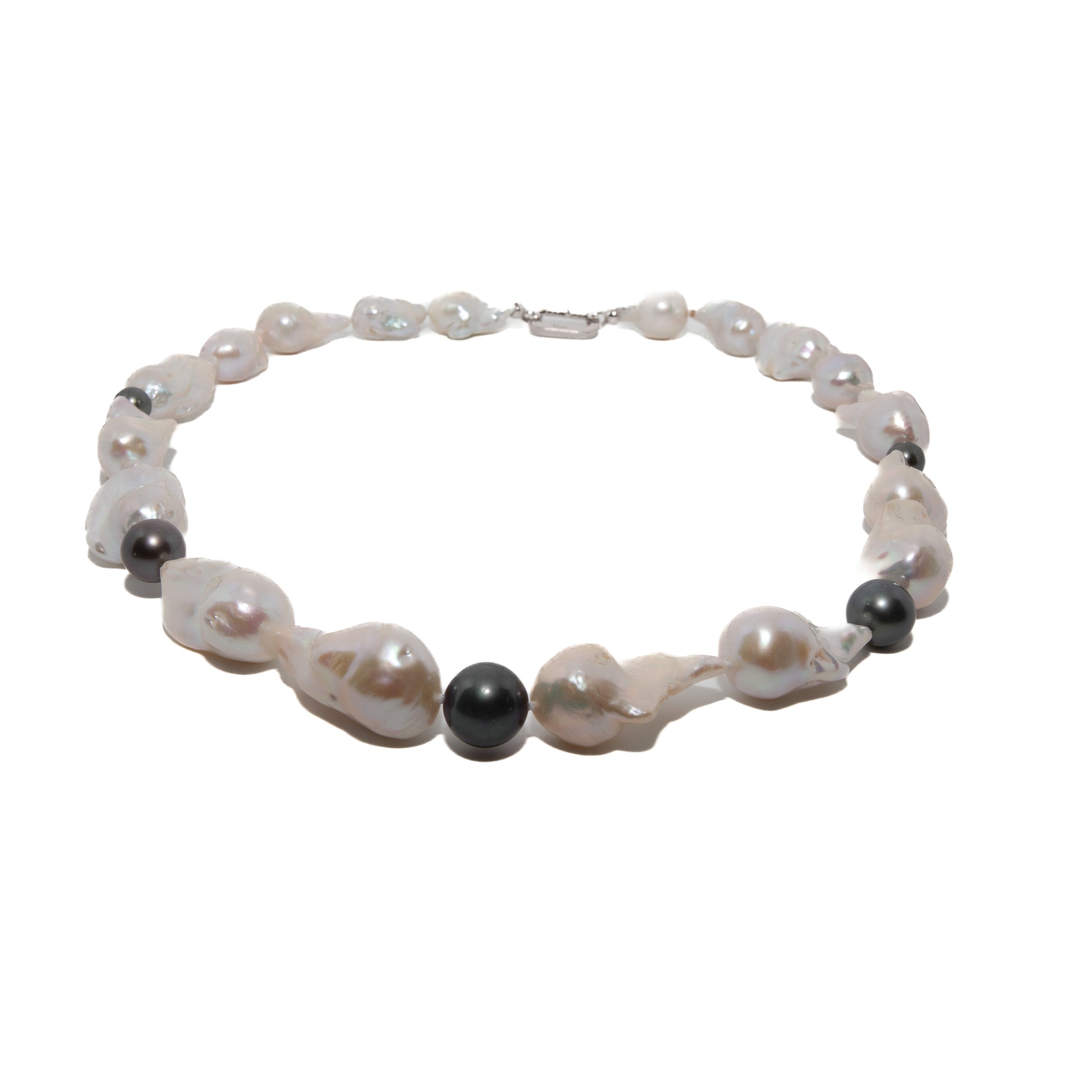 Our Botero Baroque & Tahitian Necklace features luxurious Tahitian pearls paired with sculptural baroque pearls along a 25-inch strand. This one-of-a-kind design exudes elegance and individuality, making it a true statement of artistry and grace.