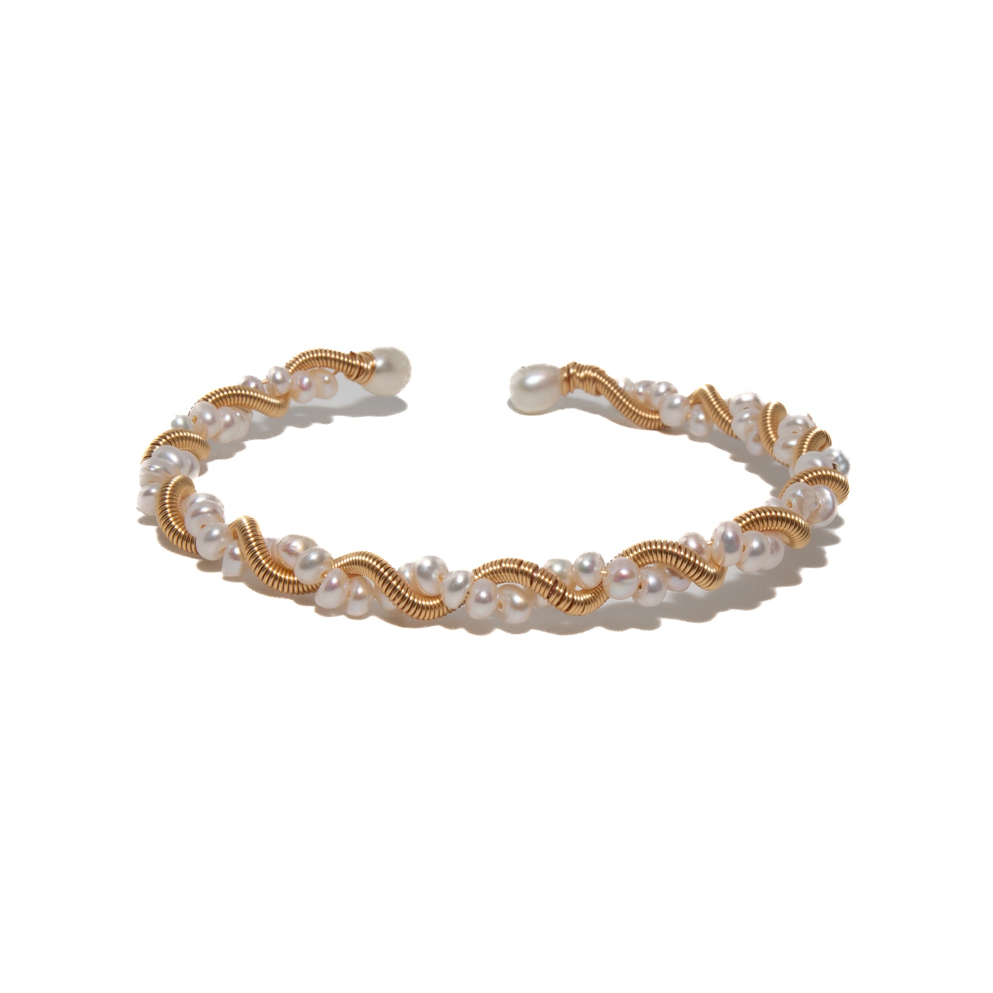 Our Garland Bracelet is handcrafted with luminous white freshwater pearls entwined around a coiled gold-filled band, capturing movement and light in perfect harmony.